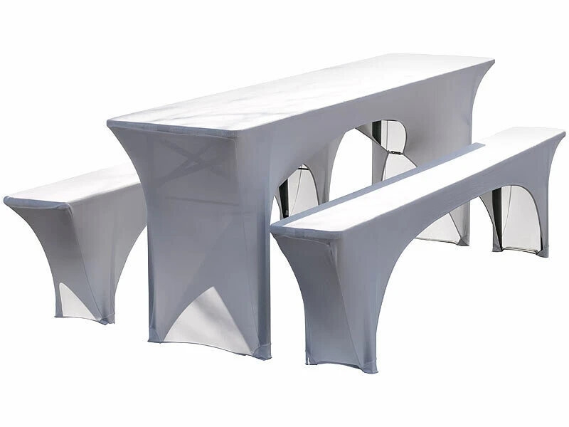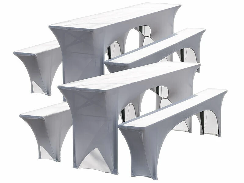 Embellissez vos tables de jardin avec ces 6 housses extensibles pour tables et bancs, coloris blanc, de la marque Infactory. Les housses élastiques recouvrent vos tables et vos bancs pour leur conférer un aspect lisse et homogène.