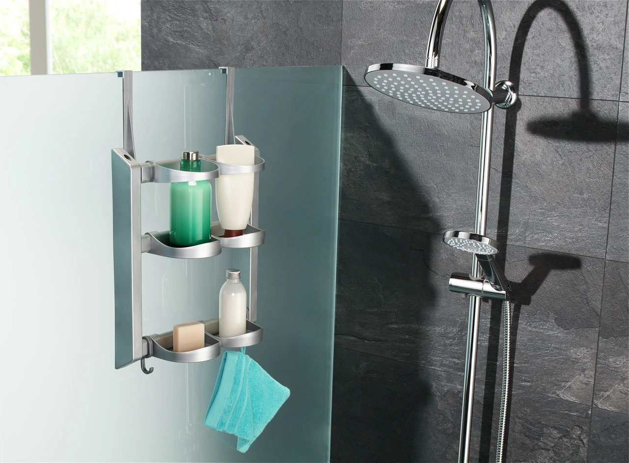 Marre de chercher partout vos produits de douche lorsque vous êtes déjà trempés ? Cette étagère garde 4 de vos produits préférés à proximité de vous et à hauteur de visage. Nul besoin de percer quoi que ce soit : l’étagère s’accroche à une vitre de douche ou tout autre rebord avec ses 2 crochets; mais vous pouvez aussi le fixer au mur si vous préférez ! Utilisez également les 2 crochets situés sous l’étagère intérieure pour accrocher un gant ou une pomme de douche.