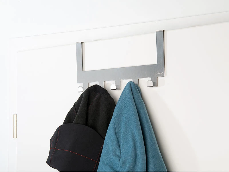 Aucune installation n’est nécessaire : il vous suffit de poser la patère sur la porte. Et vous obtenez immédiatement 5 crochets, pour y accrocher serviettes de toilettes, peignoir, vestes et vêtements. C’est très pratique sur une porte de chambre, de salle de bains ou de placard. Placez la patère sur la porte de votre choix, même d’une largeur atteignant 4,5 cm. L’avantage de cette méthode de rangement : la porte reste parfaitement intacte. Car vous n’avez pas à y percer de trou, et la partie de la patère en contact avec la porte est recouverte de caoutchouc pour ne pas la rayer.