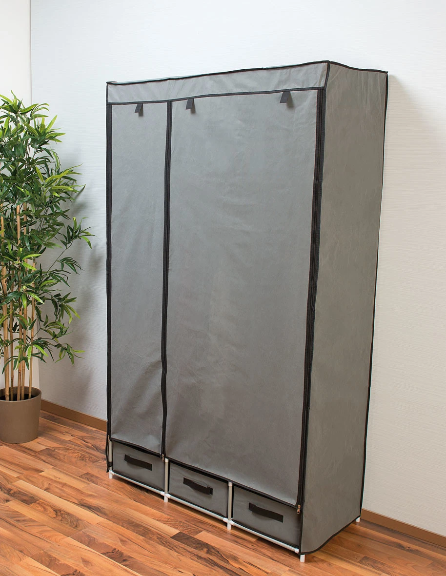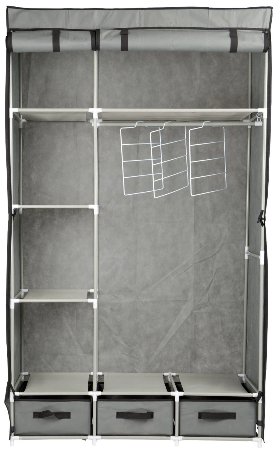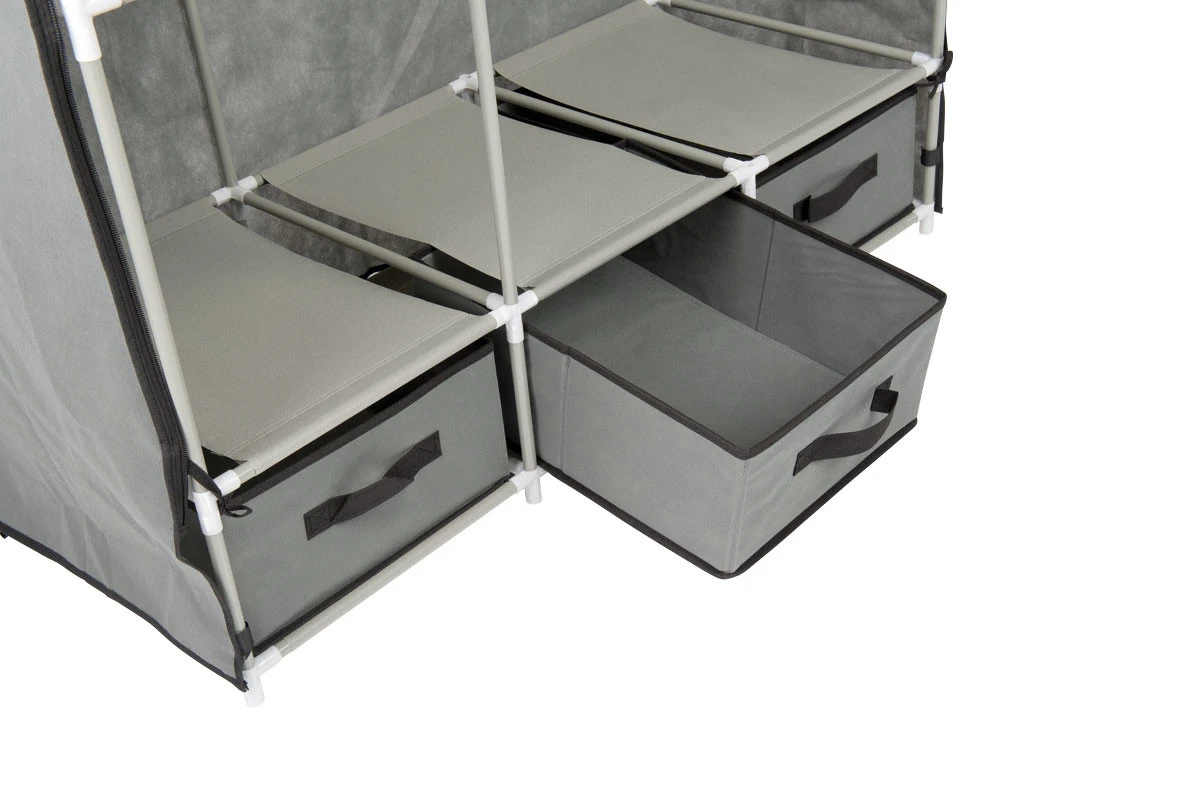 Avec ses 6 étagères, ses 3 tiroirs et sa tringle à linge, l’élégante armoire en tissu vous offre un espace de rangement énorme. Fermez les portes enroulables à l’aide d’une fermeture à glissière. Ainsi, vos vêtements, chaussures et draps restent protégés de la poussière et de la saleté.