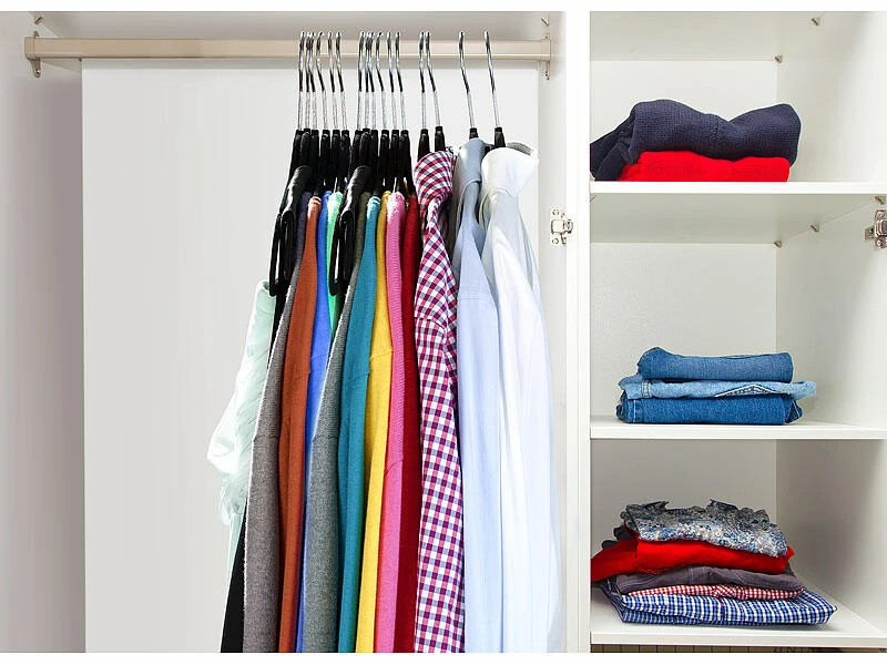 Ces quelques cintres vous permettront de ranger votre entière garde-robe ! Suspendez-y chemises, vestes, mais également pantalons, foulards ou cravates : les petites encoches et le revêtement velouté empêchent vos vêtements de glisser. Et grâce à leur design extra-plat, les cintres trouvent leur place même dans les armoires les plus remplies. Accrochez-les sur n’importe quelle tringle : il vous suffit de tourner le crochet pivotant pour orienter au mieux votre cintre.