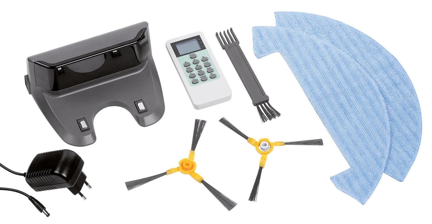 - Robot aspirateur PCR-3500, 2 brosses latérales, 2 dispositifs de lavage, (1 de rechange), réservoir d’eau, bac collecteur de poussière, télécommande, station de chargement, adaptateur secteur, pinceau de nettoyage, mode d’emploi en français