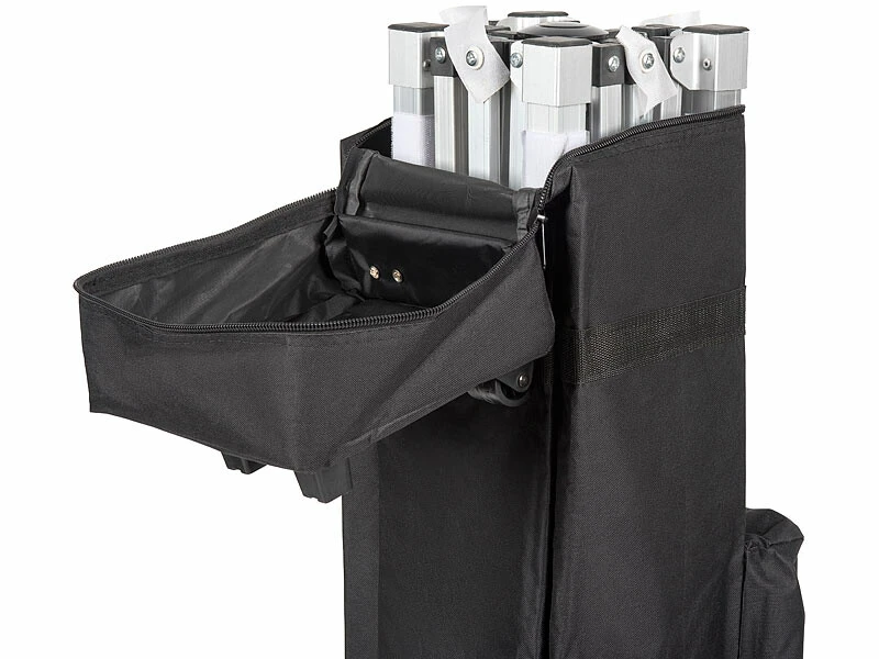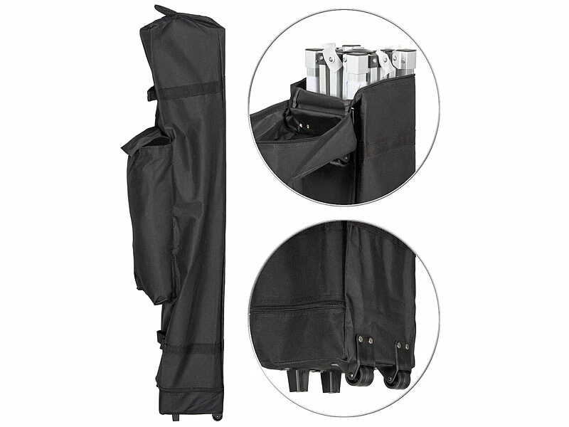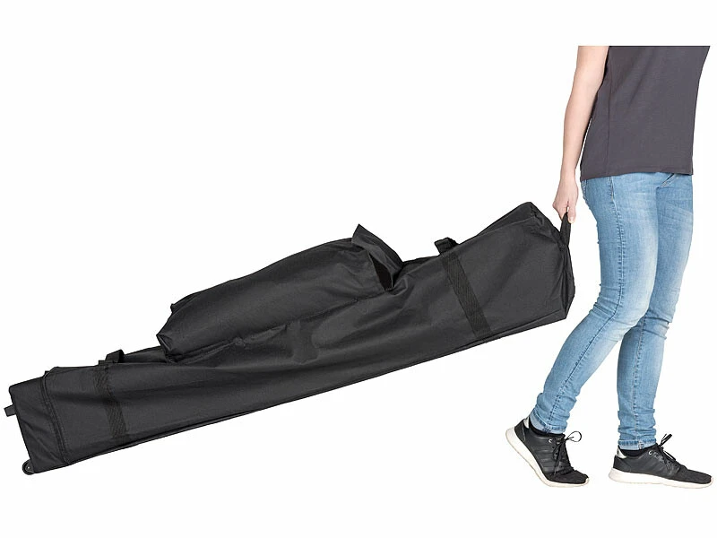 Votre pavillon de jardin est si pratique que vous aimeriez l’emporter en vacances ? Avec le sac à roulettes, c’est un pur jeu d’enfant. Rangez la structure dans le compartiment principal, et utilisez le compartiment secondaire pour les bâches, les pieds de support ou encore les sardines. Grâce aux roulettes et aux poignées de transport intégrées, le sac vous suit avec la maniabilité d’une petite valise à roulettes. Vous pouvez ainsi partir à la plage, en camping ou à la montagne en compagnie de votre pavillon pliable.